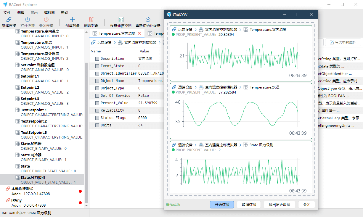 支持 COV 报告,订阅并接收消息,以图表的形式实时查看数据变化,并支持导出历史数据