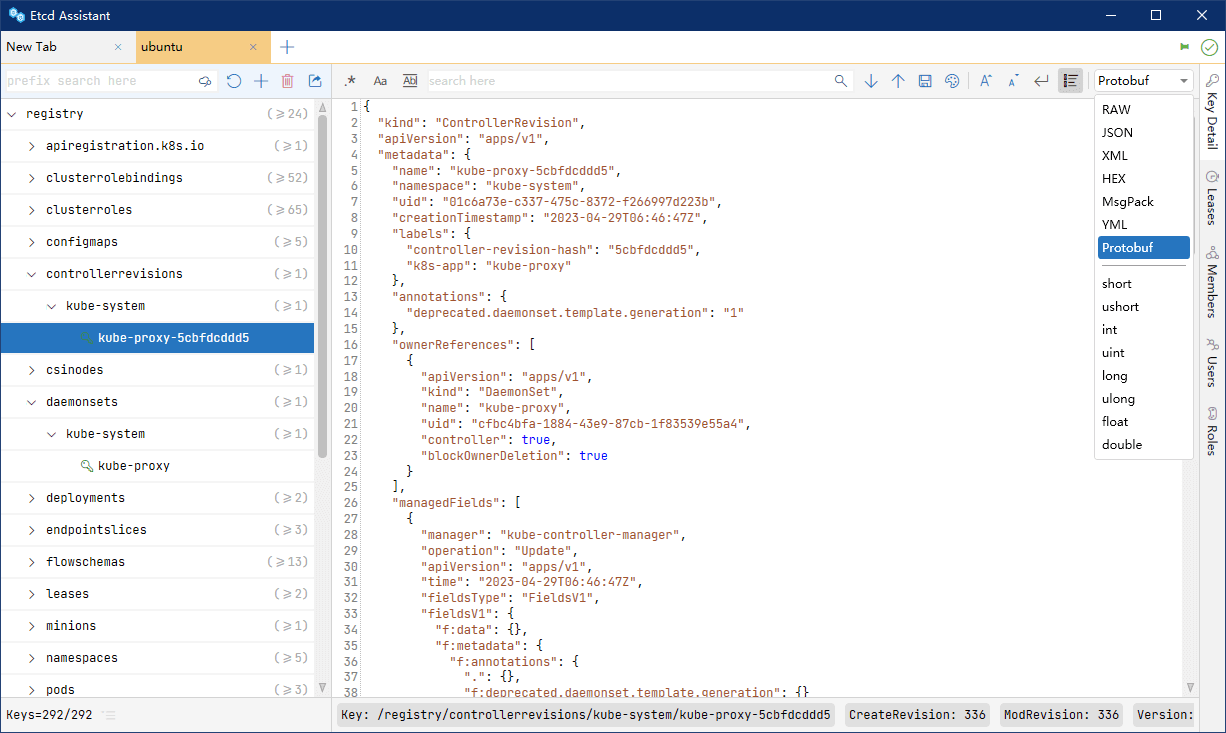 Etcd Assistant 会自动识别并格式化不同的数据格式,包括Text、JSON、XML、HEX、Protobuf、MessagePack,以及各种整数、浮点类型