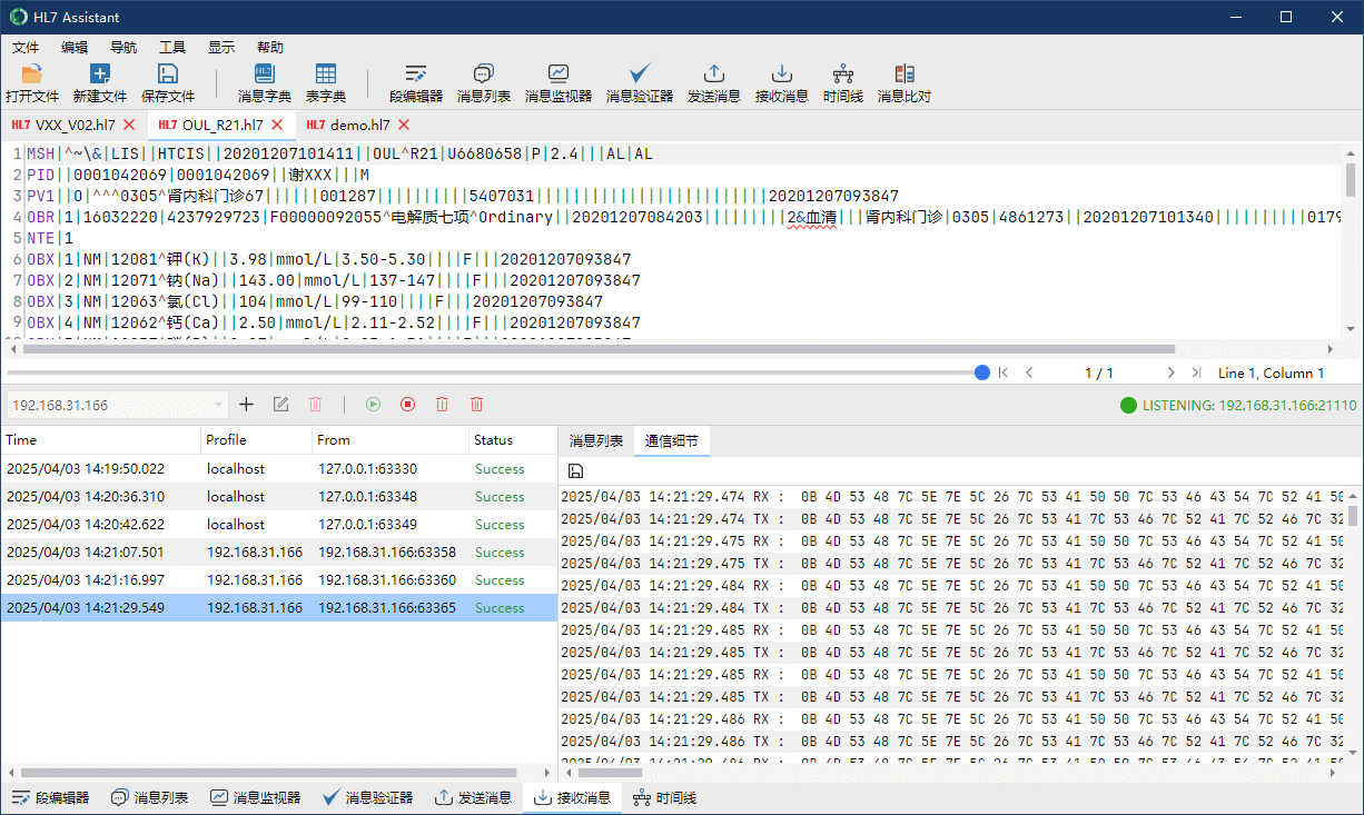 HL7 Assistant 允许您模拟和测试与支持 TCP/IP 或串口连接的 HL7 系统的数据交换。