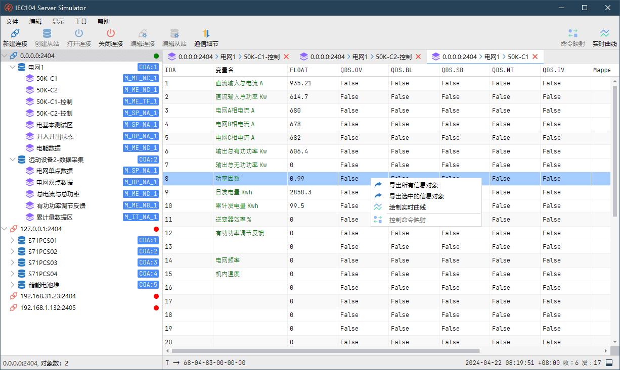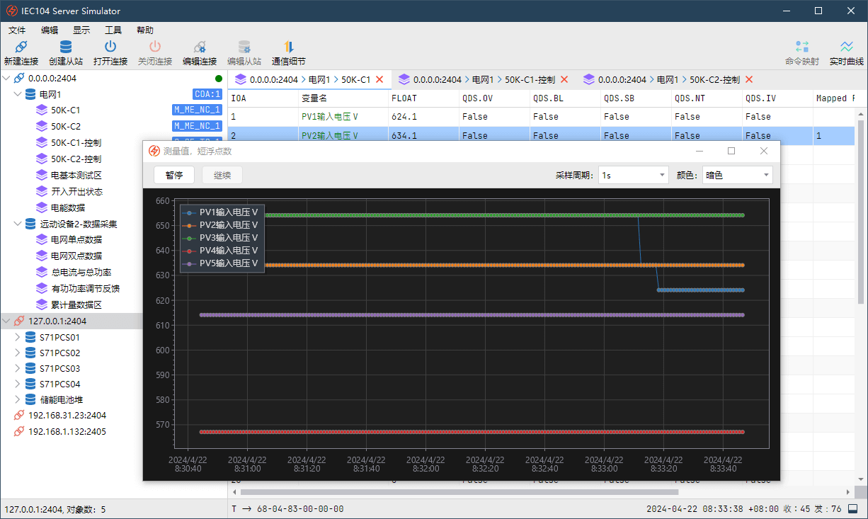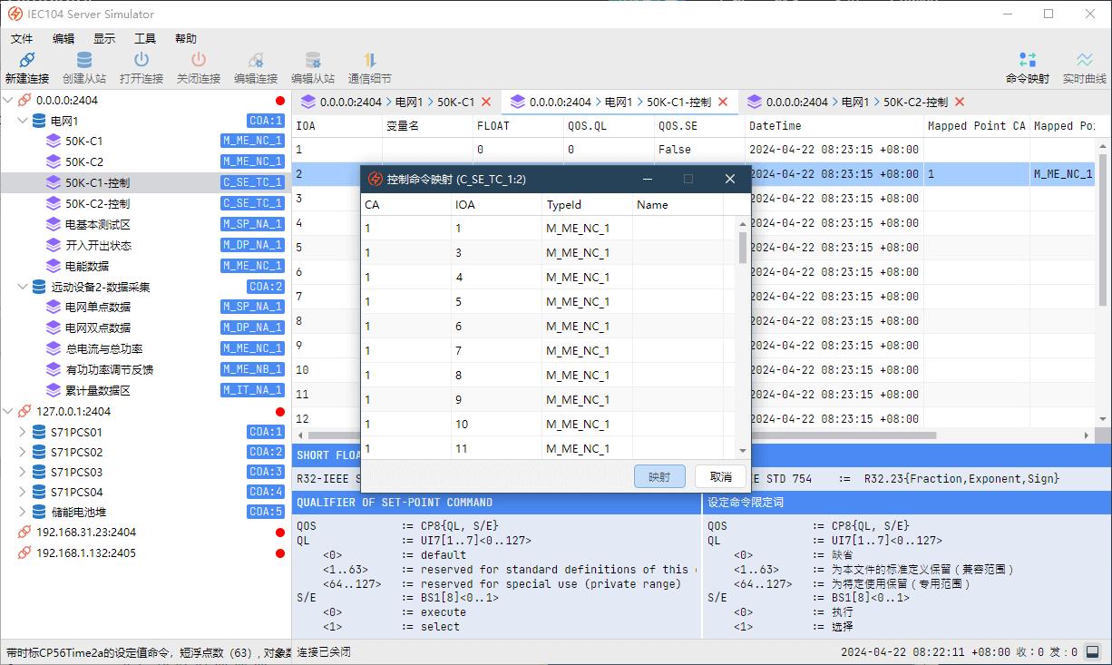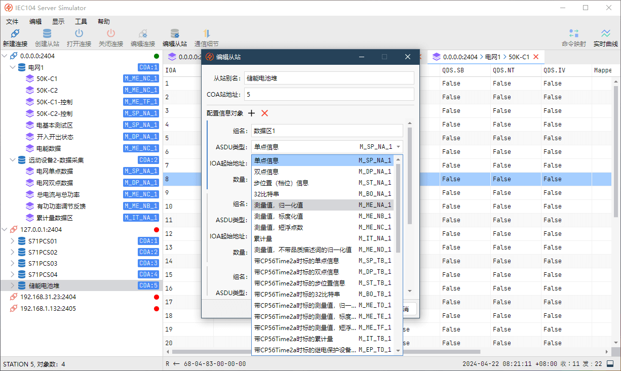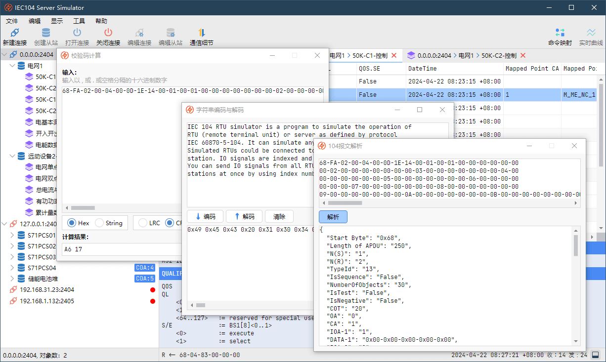 IEC104 从站/服务端模拟器——完整支持IEC104规约,同时创建多个连接,模拟多个从站,快速搭建您的测试平台。
