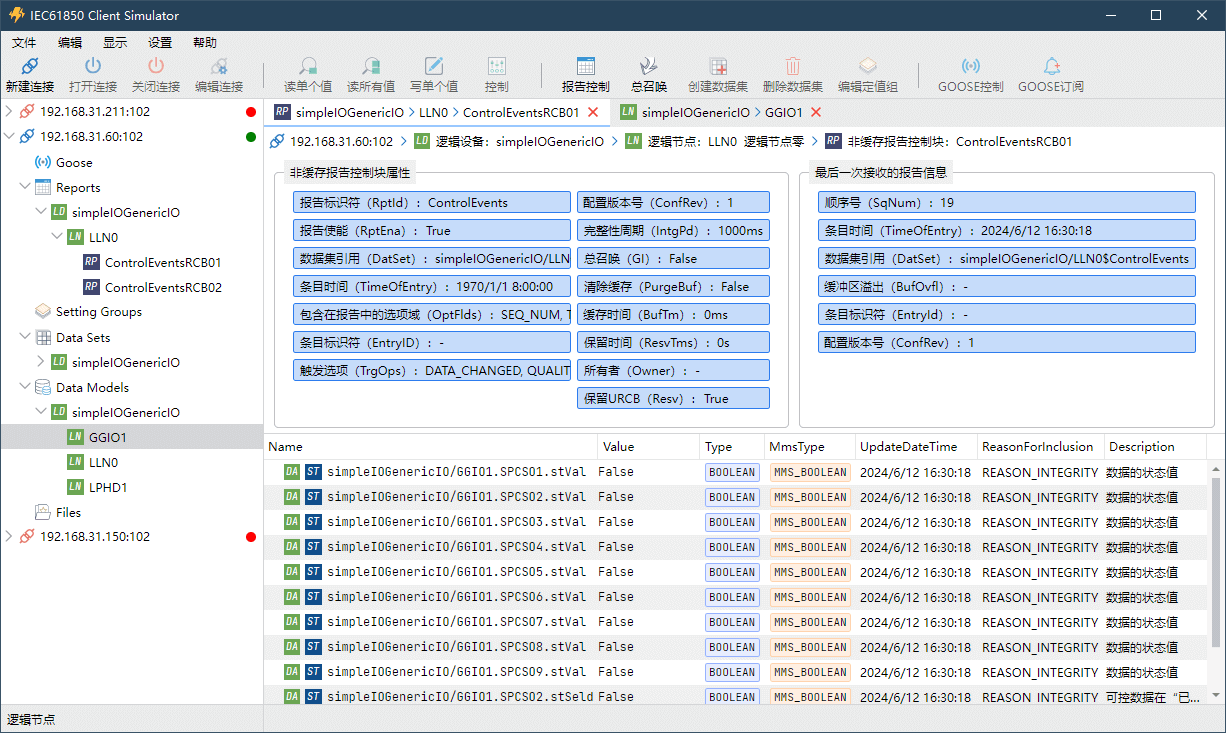 - 支持缓存报告控制块(BRCB)和非缓存报告控制块(URCB),查看报告控制块所引用的数据集,并实时浏览它们的数据变动。