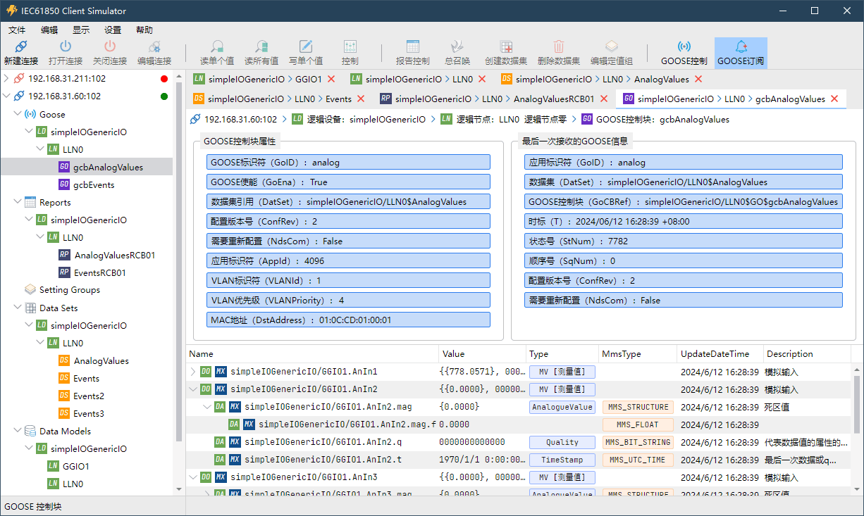 支持查看当前GOOSE控制块的属性;从装置订阅并接收数据,实时查看数据集中数据的变化情况