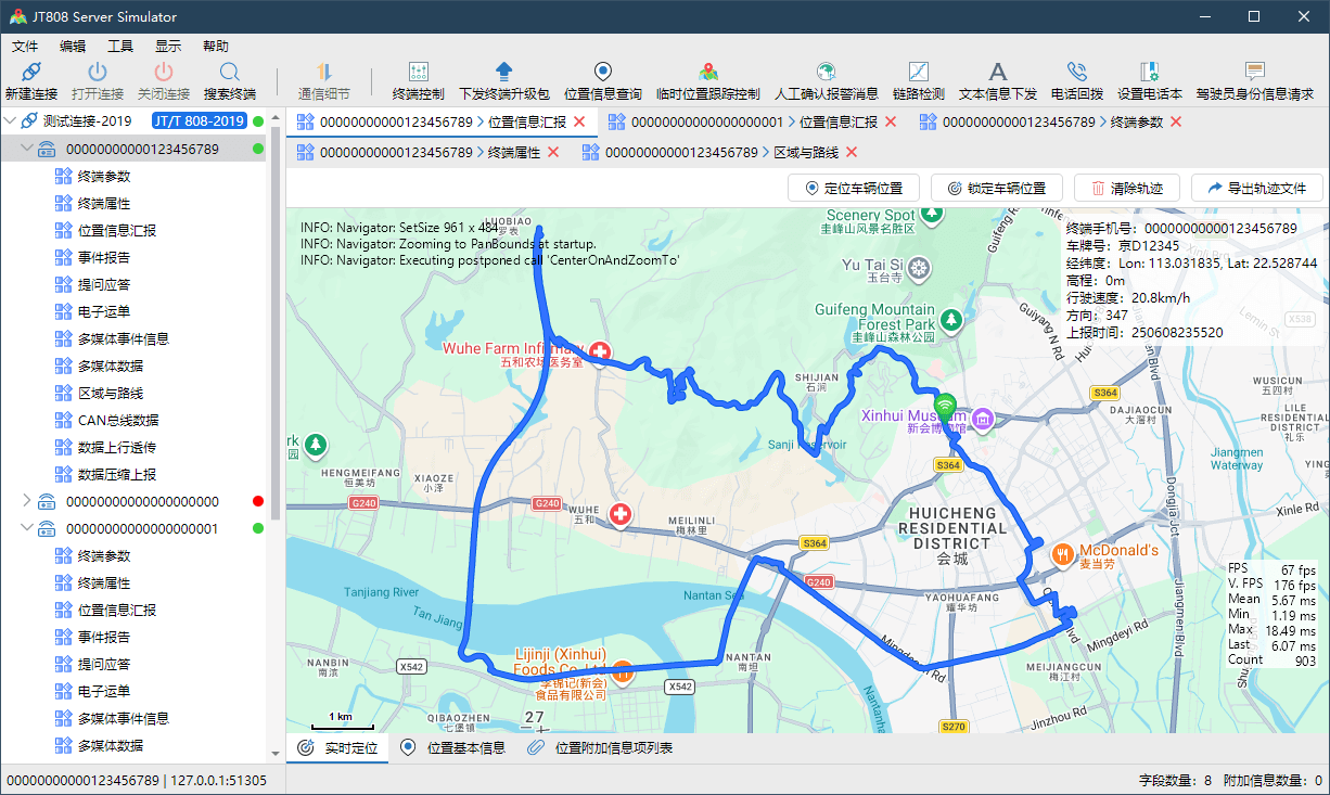 JT808 Server Simulator 允许您实时查看车辆轨迹,支持自定义瓦片地图。