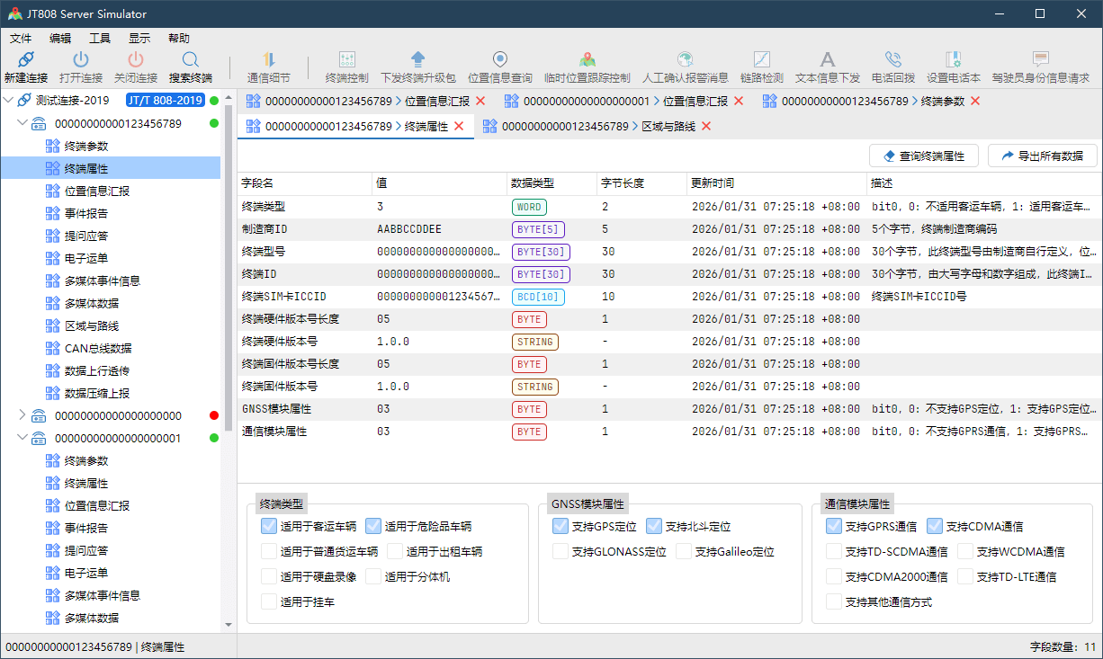 JT808 Server Simulator 支持所有 JT/T808 协议版本(2011、2013、2019),完整的消息类型支持。