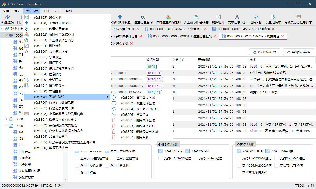 JT808 Server Simulator 支持 TCP 或 UDP 连接方式,支持消息分包。