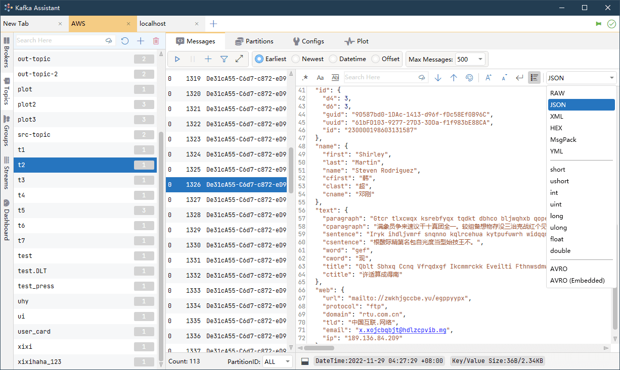 Kafka Assistant 会自动识别并格式化不同的数据格式,包括Text、JSON、AVRO、XML、HEX、MessagePack,以及各种整数、浮点类型