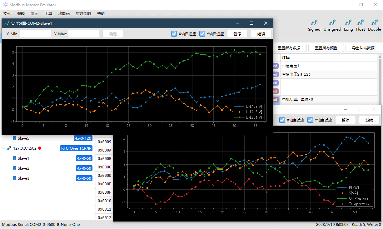 支持对任意数量的寄存器中的数据绘制实时图表,监控数据的变化趋势;并且可以导出图像