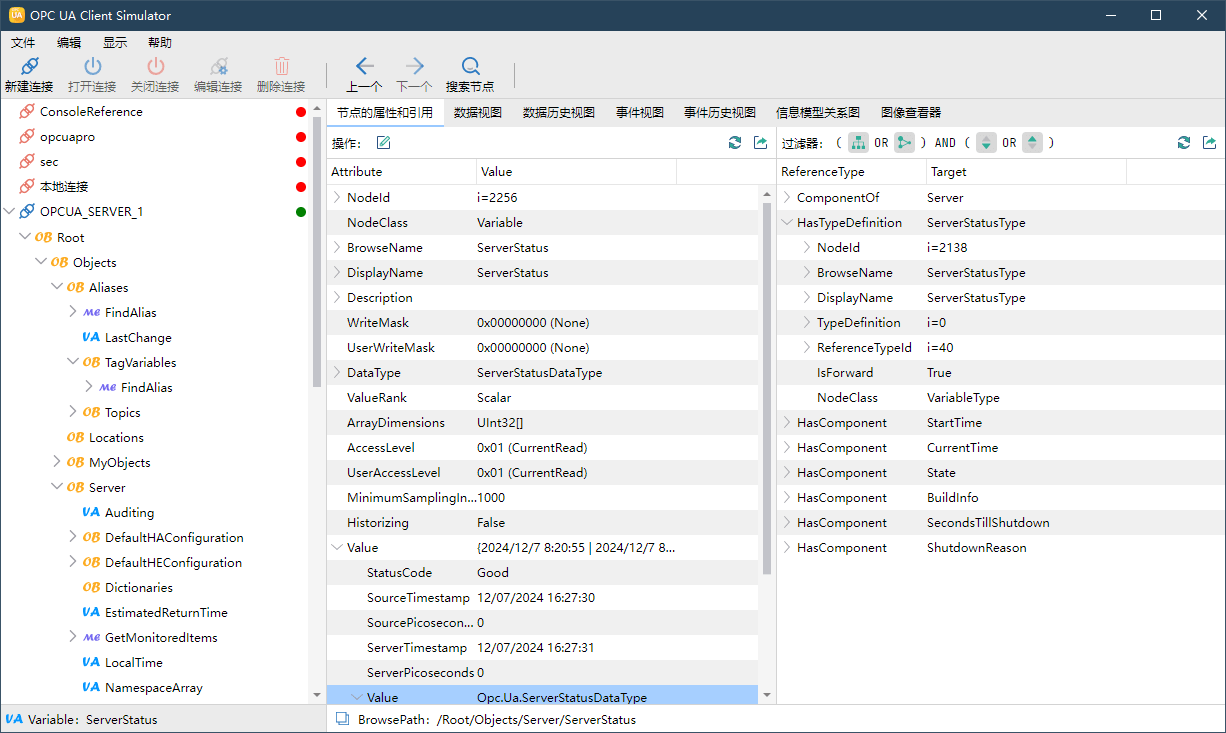 显示 OPC UA 节点的基本信息,读取和写入变量值,通过树型视图可视化复杂数据类型;在地址空间中快速导航到特定节点