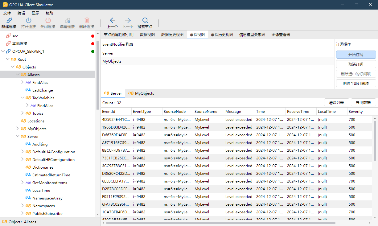 OPC UA Client Simulator 使您能够监控服务器事件,包括警报和条件。您可以选择要监控的字段,还可以确认和确认警报。